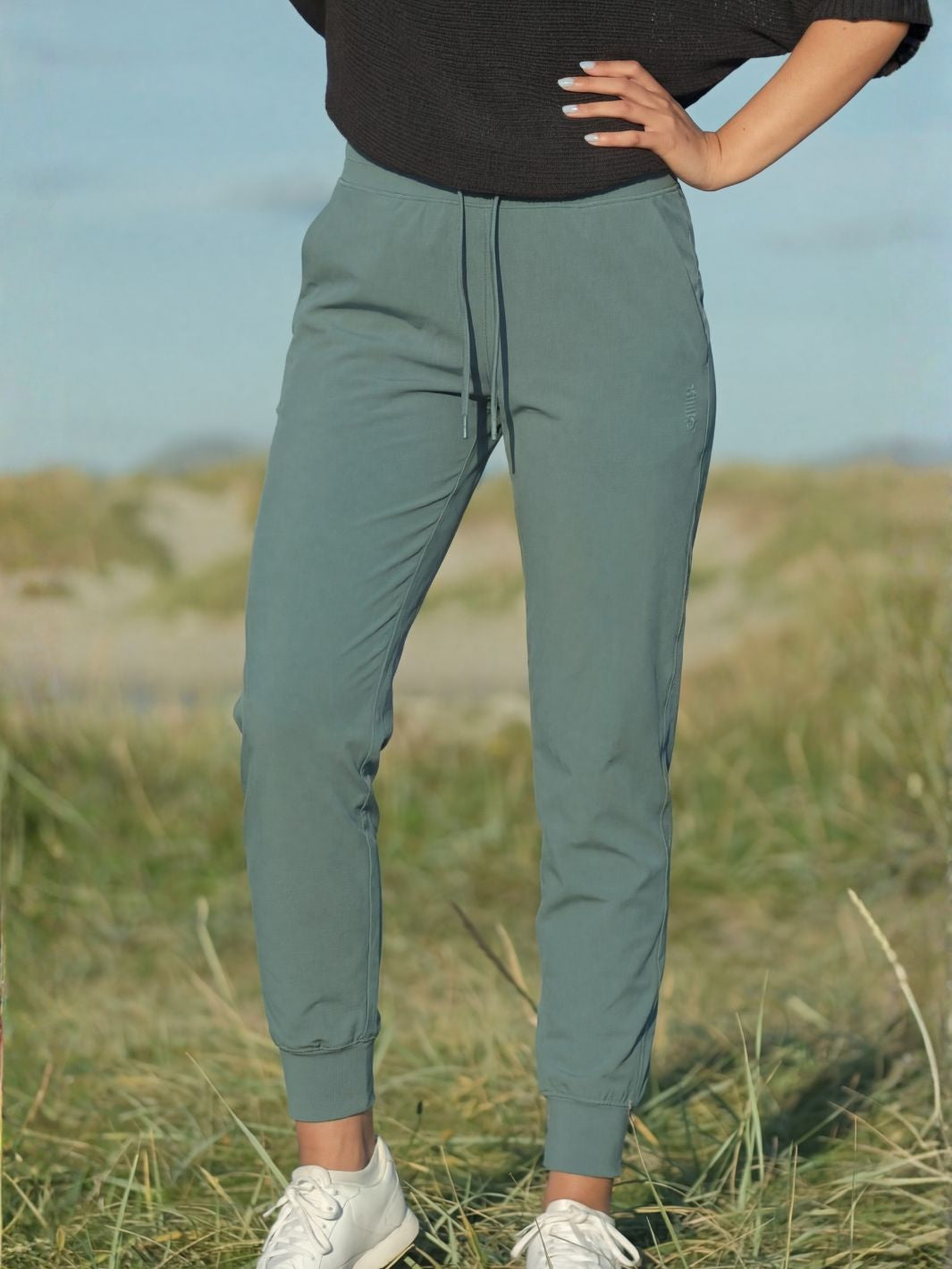 Deilig sjøfarge!! Endelig er joggebuksen her, som alle har drømt om! Deilig stoff, flott passform, og fine detaljer som brodert logo, flatterende sømmer over baken og langs sidene. To gode lommer og snøre-mulighet. Fin sjøgrønn/blå farge som kan kombineres med det aller meste. Joggebuksen kan brukes til trening eller kos hjemme. Eksklusiv bred strikk i midjen som sitter godt og føles deilig.