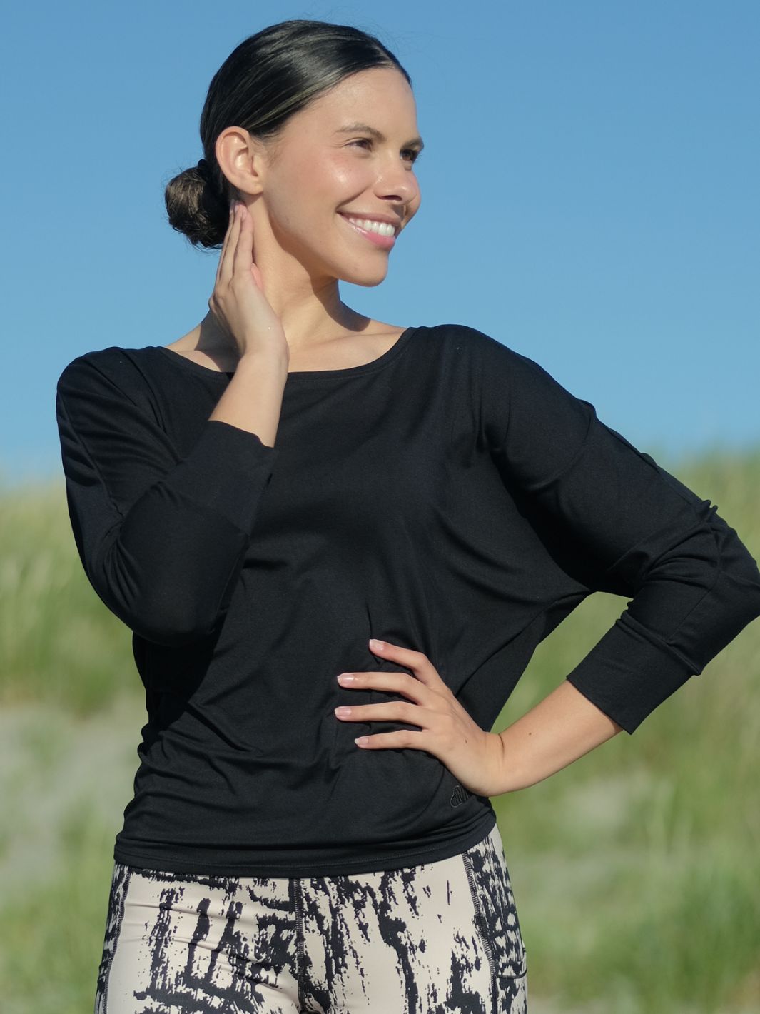 Myk og behagelig genser i løs, men flatterende passform. Laget i en blanding av naturmaterialer og funksjonsstoffer – blant annet modal, som føles ekstra god i varme omgivelser, som ved trening. Genseren er litt lenger bak enn foran, og har 3/4-ermer som faller fint. Normal i størrelsen, men noe romslig.