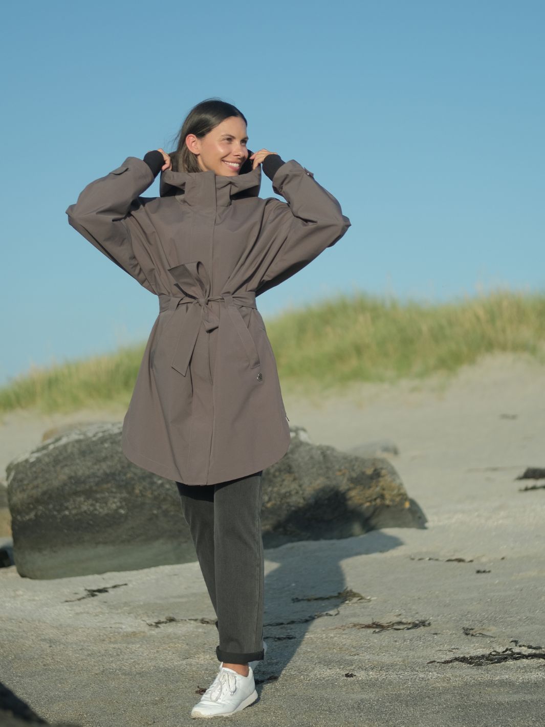 Lule The Wide Jacket er et statement-plagg som kombinerer funksjon, frihet og stil – moderne, anvendelig og effortless cool. Den faste hetten og avtakbare beltet gir fleksible stylingmuligheter, mens innvendige justeringer lar deg tilpasse passformen slik du vil. Den romslige fasongen inviterer til lag-på-lag – perfekt over strikk, fleece eller teknisk undertøy. Bruk den gjennom hele våren, høsten – og vinteren med varme lag under. Laget i førsteklasses, slitesterkt materiale med tapede sømmer og 10.000 mm vannsøyle. Diskré refleksdetaljer gjør den ekstra smart i mørket: Brett enkelt opp ermekanten for å få frem et skjult refleksbånd – perfekt på kveldstur. I tillegg finner du en subtil refleksdetalj nederst bak på jakken. Les størrelsesveiledningen
