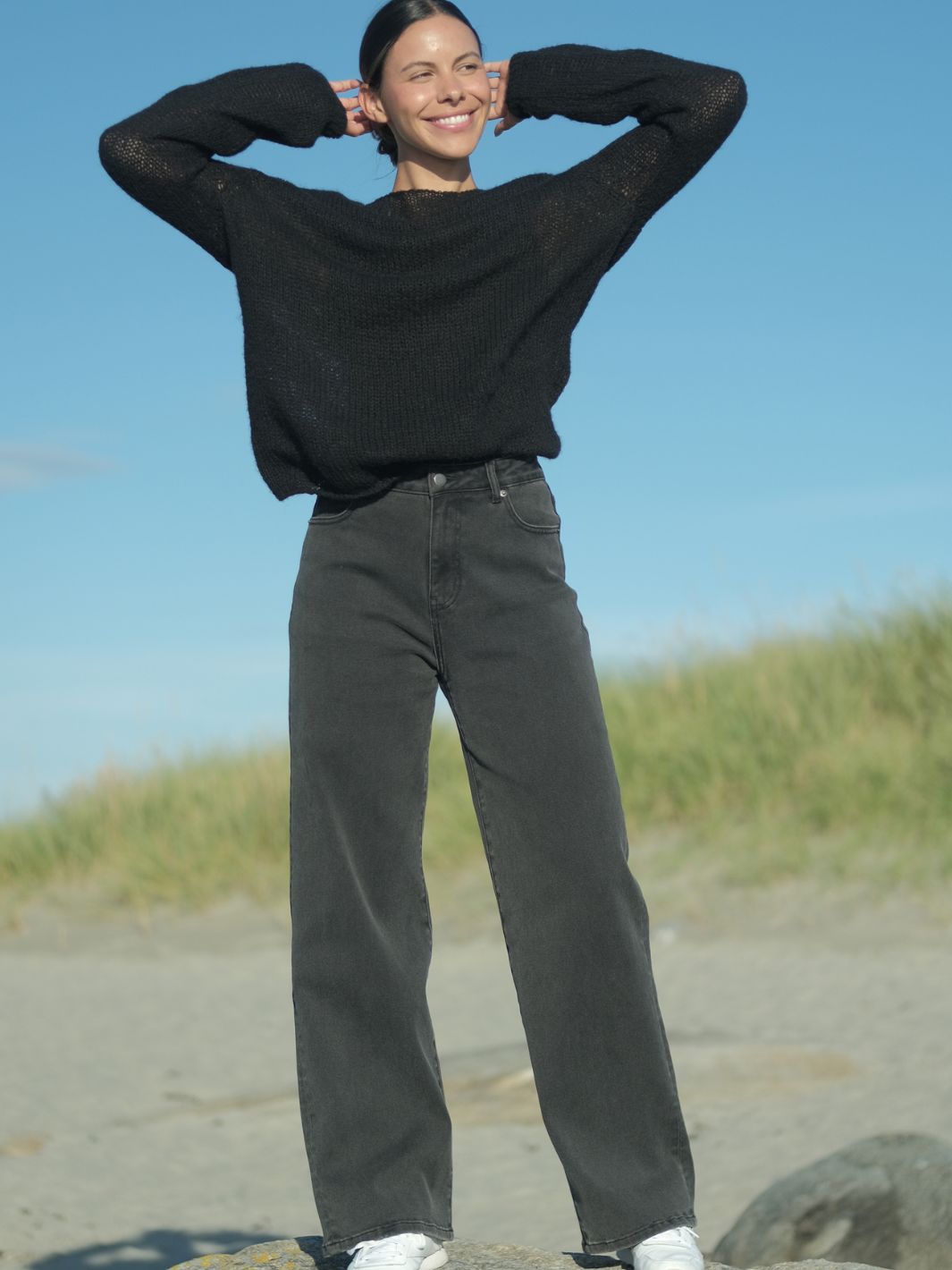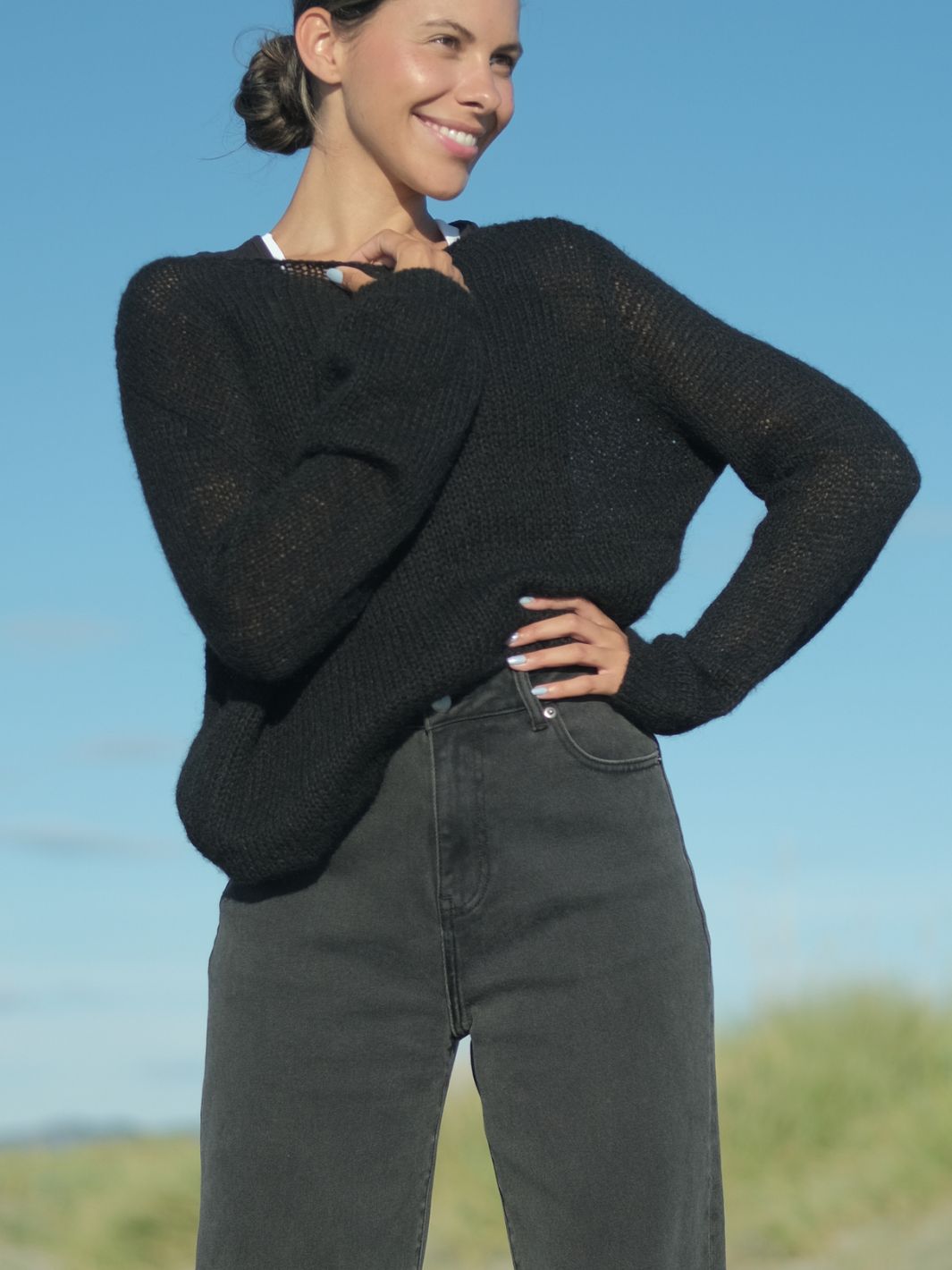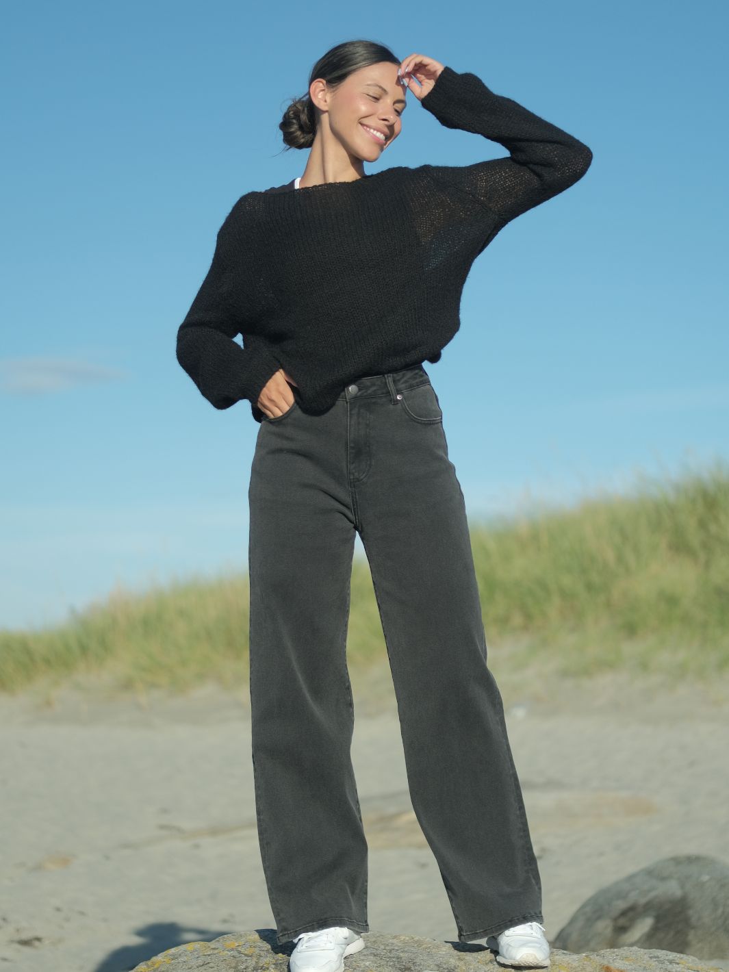 Store, luftige masker gjør genseren varm og samtidig lett – perfekt for både kjølige dager og innendørs hygge. De lange ermene har en tynn strikk nederst, slik at du enkelt kan trekke dem litt opp på armen.